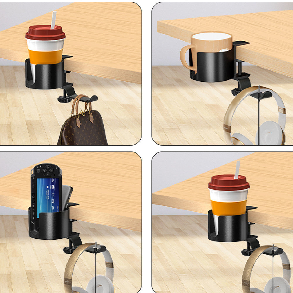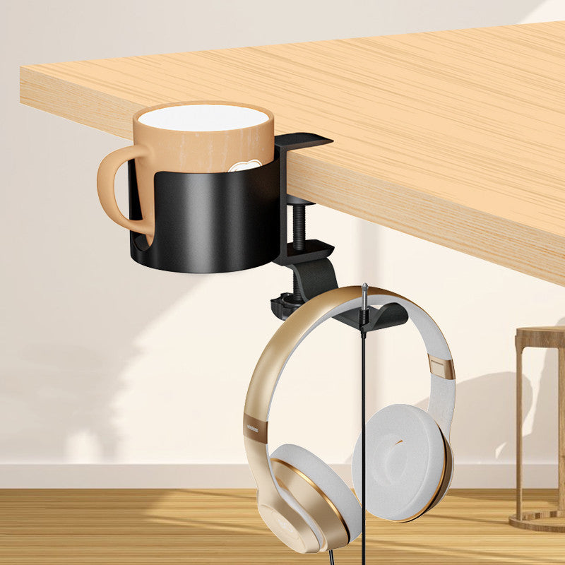 - SPACE SAVING: This headset clamp bracket with a cup holder is designed to hold headphones and other small items. It keeps your desk tidy, and its horizontal and vertical installation allows you to arrange your space perfectly.